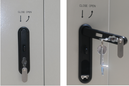 The cabinet door uses embedded structure. The door opening angle is larger than 110° and the door limit device can limit the opening angle. The lock is theftproof three point lock, supports padlock.
